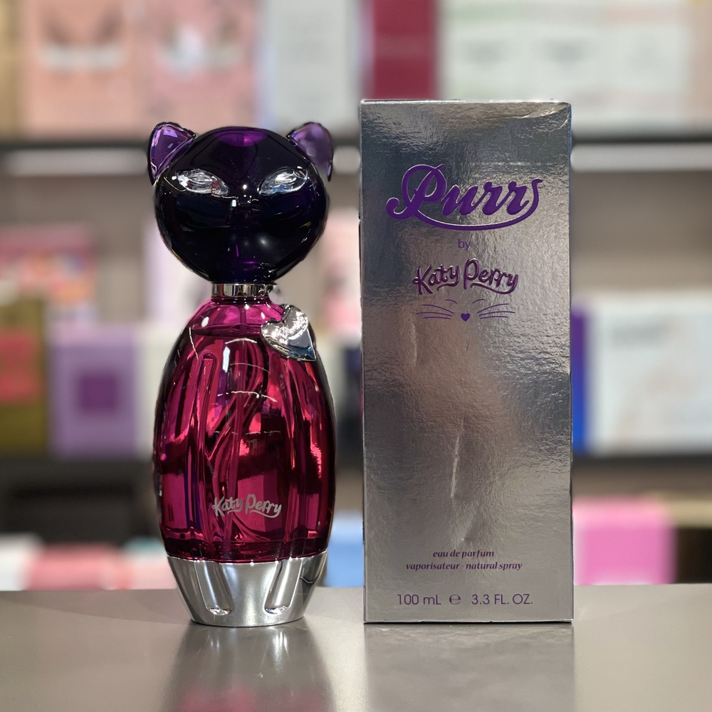 Purr de Katy Perry es una fragancia femenina de la familia olfativa floral frutal, lanzada en 2010. Se presenta en un distintivo frasco con forma de gato de color lavanda, adornado con detalles metálicos y ojos de joya.